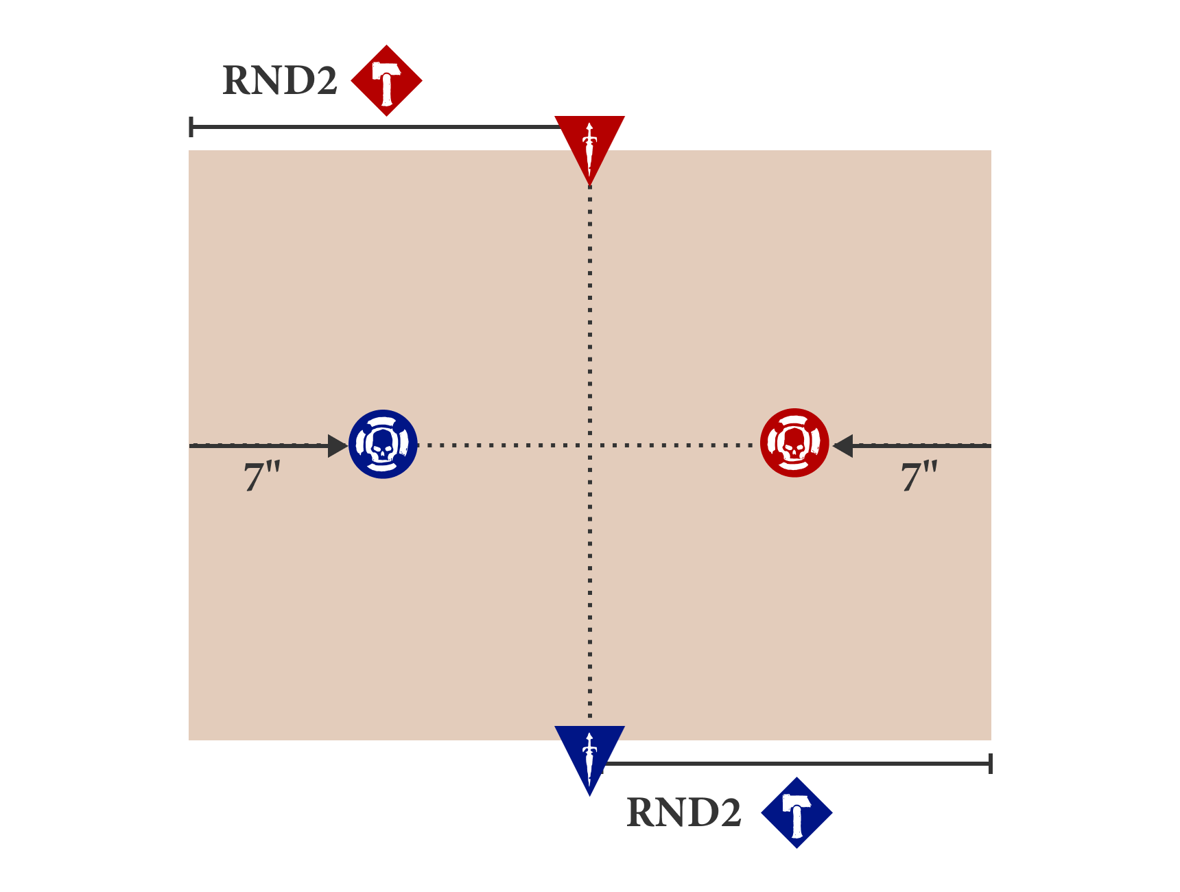 The first way to set up a matched play battle involves the Matched Play runemark (). If you are using battleplan cards, first remove all the cards in the decks that do not have the Matched Play runemark (), then follow the standard rules for setting up a battle. If you are using the battleplan generator, when you are rolling for the deployment map and victory condition, simply use table A (all the results in these tables have the Matched Play runemark ()). In both cases, do not generate a twist.