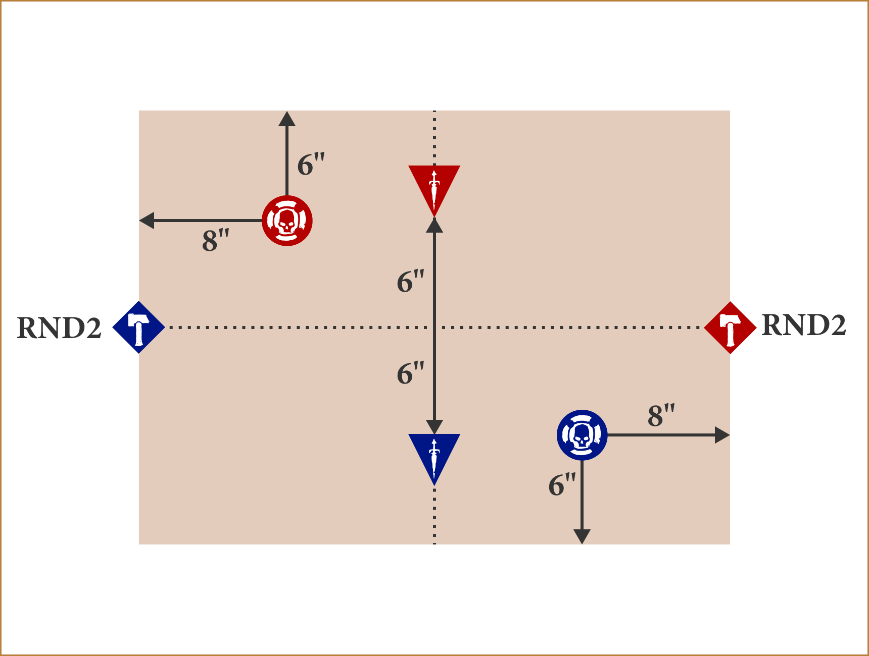 Another way to approach matched play is to use a set battleplan called a matched battleplan. In this section you will find 6 matched battleplans. These battleplans each have fixed deployment maps and victory conditions that work especially well together, and each is designed to test your warbands in a different way, with equal focus on treasure grabbing, objective scoring and manoeuvring. In addition, the positions of objectives and treasure tokens are fixed, as shown on the deployment maps.