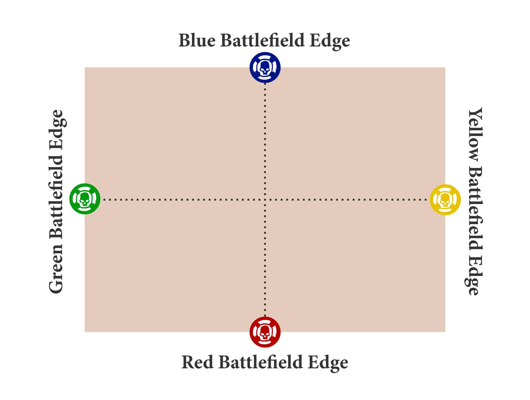 See map. Each warband starts with 1 battle group on the battlefield and 2 battle groups in reserve. The battle group that starts on the battlefield is etermined randomly for each player: in priority order, each player chooses their deployment colour and then rolls a D3 to determine what battle group starts on the battlefield.