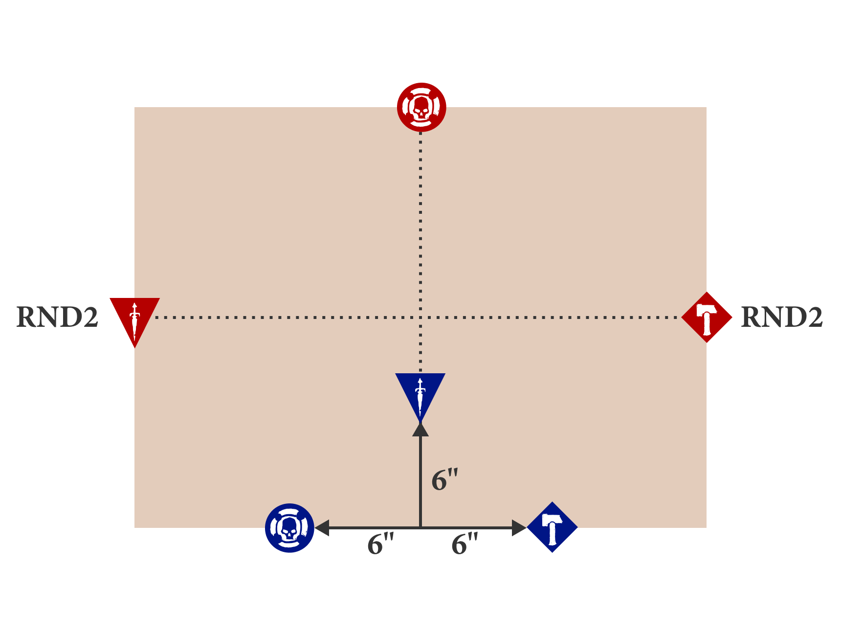 3 deployment cards are drawn. Each player discards 1 of them, starting with the Lumineth player – the remaining card is used. The Lumineth player chooses who is red and blue, and orientates the deployment card.