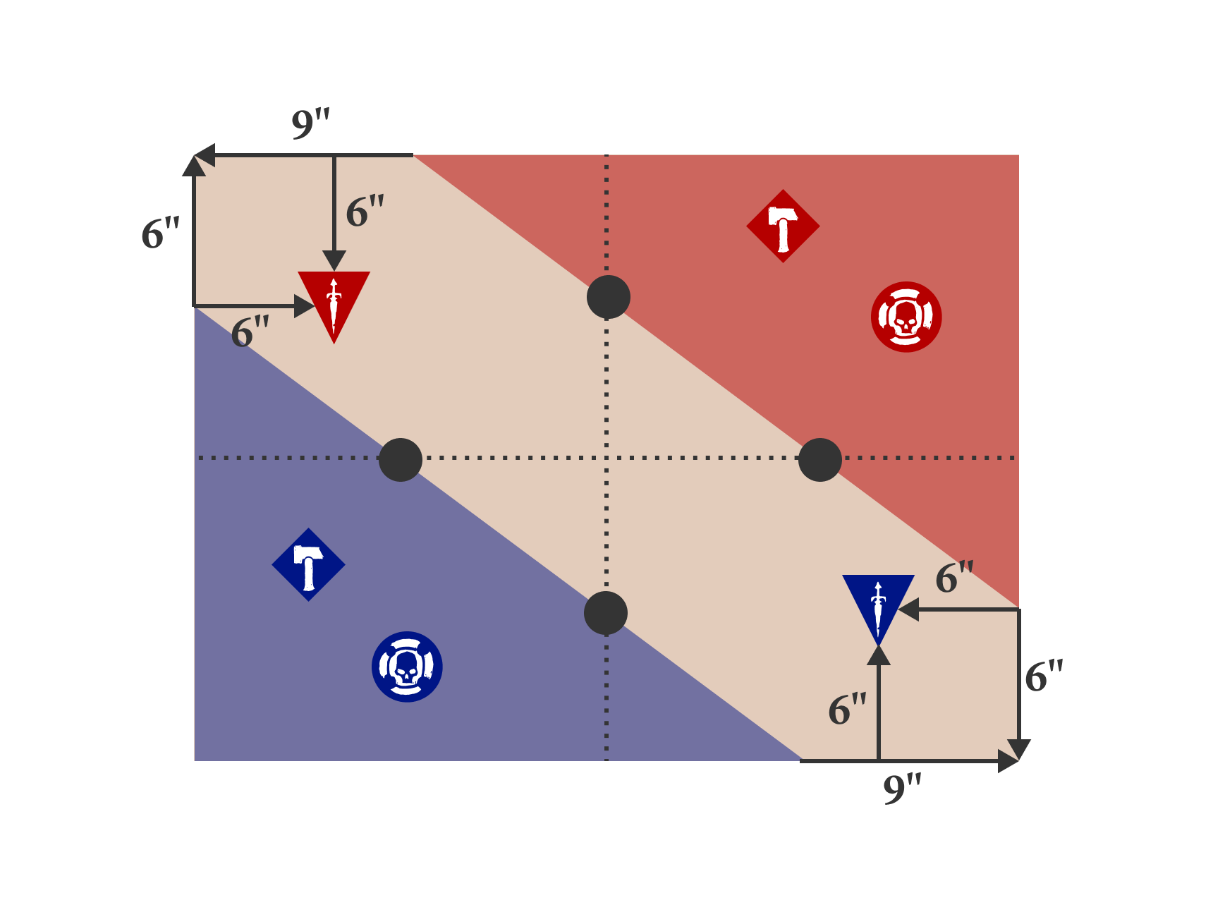 Use the deployment map below. The defenders are blue and the attackers are red. Each black circle is an objective and must be placed on the battlefield floor. If a terrain feature is blocking the placement of an objective, place the objective on the battlefield floor as close as possible to the position marked.