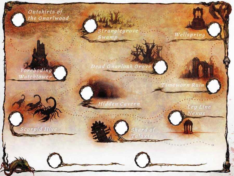 Over the course of your campaign, your warband's encampment will relocate as your warriors discover promising sites deep within the Gnarlwood, or your enemies learn of your current encampment's whereabouts.
