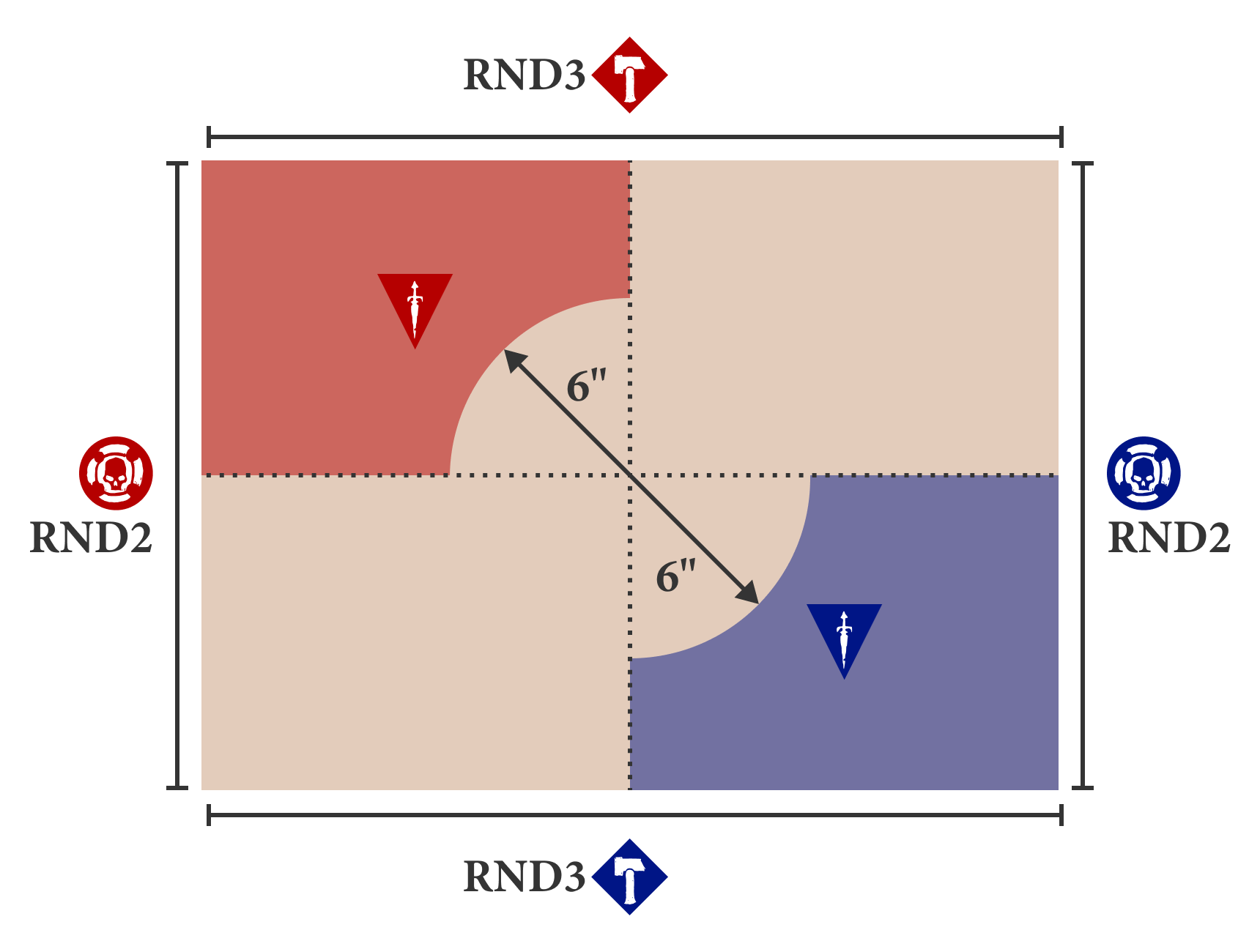 The battlefield is divided into quarters as shown on the deployment map. At the end of each battle round, if a team has more fighters in a quarter of the battlefield than there are enemy fighters in that quarter, that team captures that quarter. If one team captures more quarters than the other, they win that battle round.